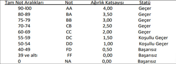 • Sınav değerlendirmelerinde esas alınacak harf notları, ağırlık katsayıları ve başarı statüleri aşağıda yer almaktadır.